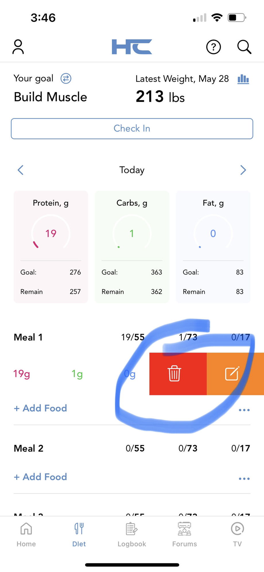 To delete/edit logged food from the day - use the swipe gesture. To delete created food - find it in Add food > My food > use swipe gesture then delete.